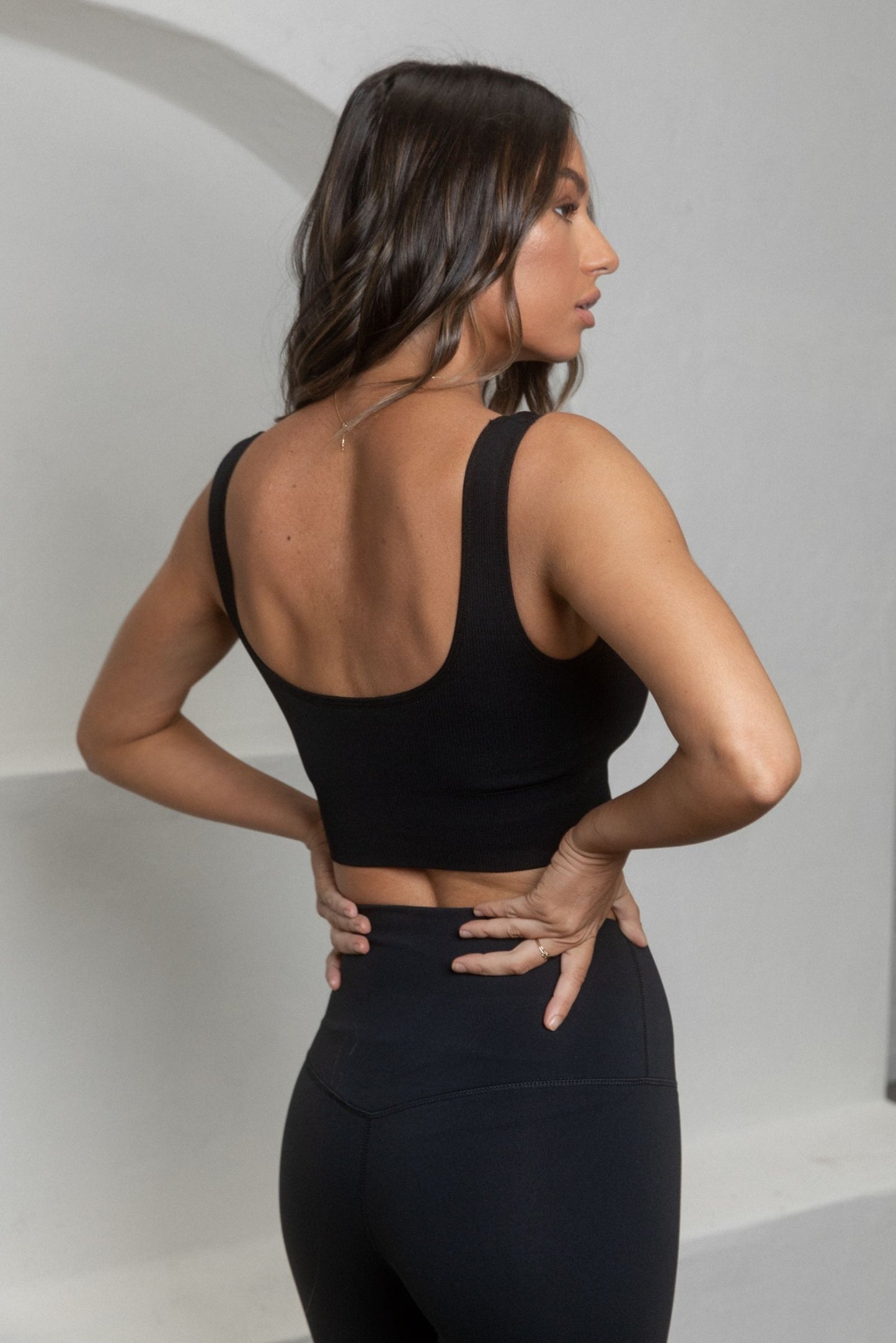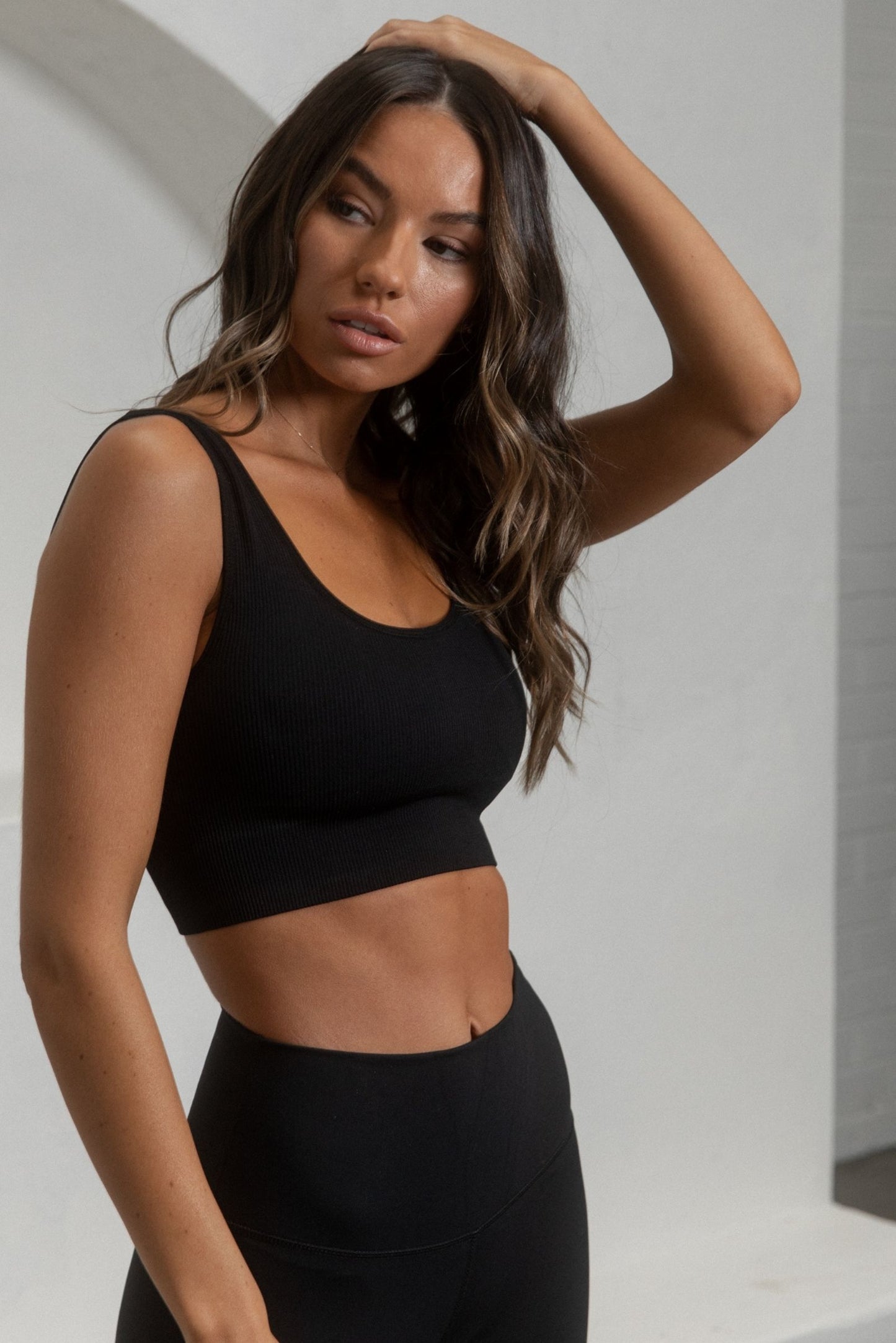 The Flex Ribbed Padded Sports Bra is made with a Micro Fiber Nylon and Spandex Blend offering a sleek and soft fit. It's long body and flattering neckline will be your must-have not just for a workout but to wear out as a top or paired under your Fleecelux sweatshirt. Model is wearing our Core Legging in Black size S.